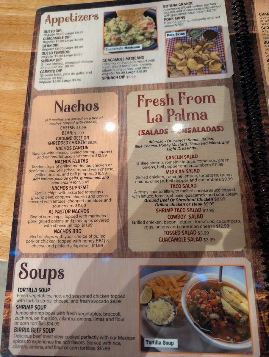 The menu highlights a variety of flavorful options, from freshly made guacamole and chips to hearty entrees like steak and shrimp, chimichangas, and sizzling chicken fajitas. Fans of classic Mexican bites can enjoy favorites like quesadillas, enchiladas, and tortilla soup, while the selection of margaritas — including colorful rainbow and lime varieties — complements the vibrant, friendly atmosphere.